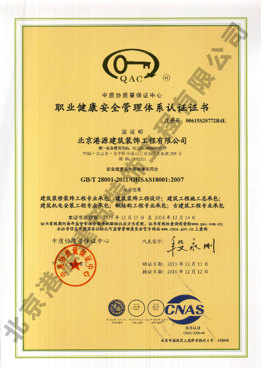 职业健康安全管理体系认证证书